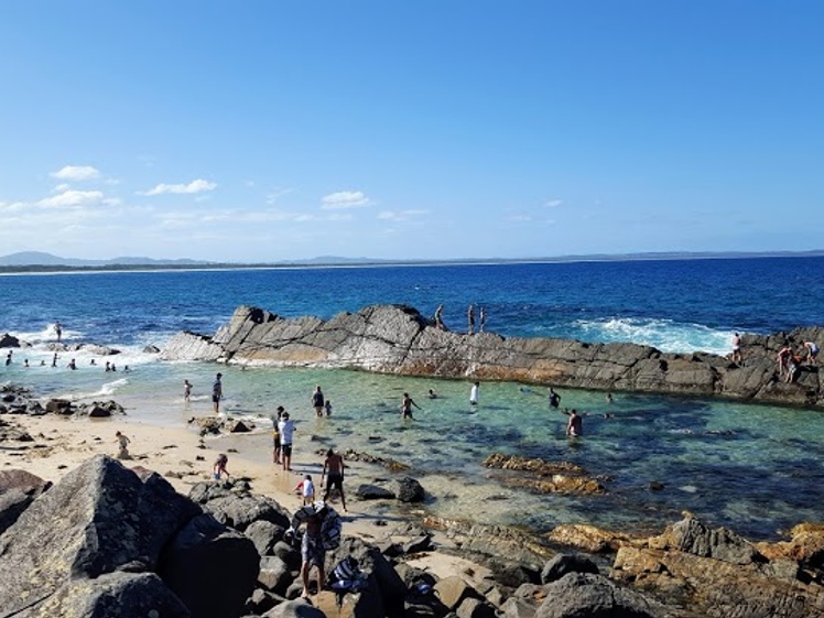 The Tanks, a striking rock formation along the Bicentennial Walk, creates a picturesque rock pool perfect for enjoyable family swimming and snorkeling activities. The name “The Tanks” originates from… a group of steel ship tanks that were once situated here during the construction of the Forster breakwall in the 1890s. These tanks supplied water for the steam engine trains, which transported quarried rocks from Bennetts Head to the current breakwall location. During high tide, The Tanks are filled with water, and as the tide recedes, it unveils the sandy base. The majority of the swimming area is shielded from incoming waves by natural rock formations, providing a safe and entertaining environment for children to swim in. To reach The Tanks, it is advisable to park along Head Street and take a stroll through the nearby reserve toward the ocean. Picnic tables and public restrooms are conveniently located, as well as Pebbly Beach, which features a park and BBQ facilities. Please note that this location is not monitored by lifeguards.